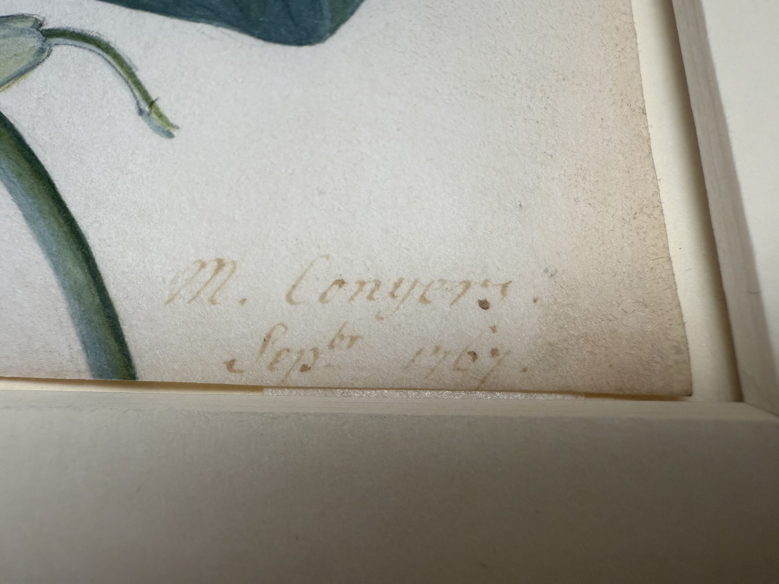 – Description of the three Botanical works by Matilda Conyers in the The Huntington Library, Art Museum, and Botanical Gardens. These were included in the exhibition: “In Pursuit of Flora: 18th-Century Botanical Drawings from the Huntington’s Art Collections”. The Huntington is the only museum in the US where we could locate Botanical illustrations by the first Mathilda Conyers. Interestingly, the Huntington’s watercolors were created in the very same year of 1767, and are part of the same series and with the same dimensions (9 x 6 1/4 in) as our work.